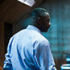 Description: Idris Elba from behind, wearing a buttondown blue shirt