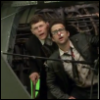 Description: Charlie Day and Burn Gorman leaning out of a helicopter; Charlie Day has something jammed up his nose.